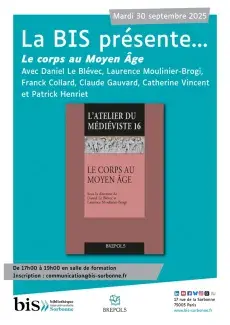 Pour cette première séance de l'année 2025-2026, la "BIS" vous propose une rencontre avec les directeurs, Laurence Moulinier et Daniel Le Blévec, et des auteurs de la monumentale synthèse collective, parue en mai dernier chez Brepols : "Le corps au Moyen Âge". Avec Franck Collard, Claude Gauvard, Catherine Vincent et Patrick Henriet.